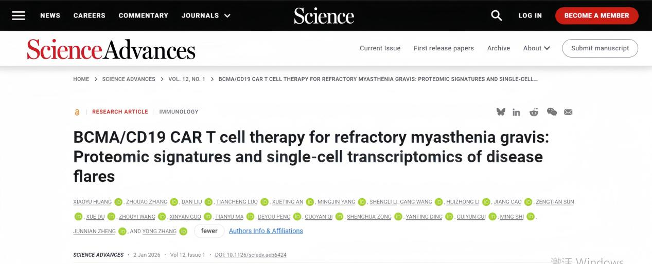 1月2日,徐州医科大学细胞治疗药物产业学院施明团队联合徐医附院神经内科崔桂云、张勇团队,在国际顶级期刊《Science Advances》在线发表了题为“BCMA/CD19 CAR T cell therapy for refractory myasthenia gravis: proteomic signatures and single-cell transcriptomics of disease flares”的研究论文,标志着学院在高水平基础研究与成果转化方面取得新的突破。