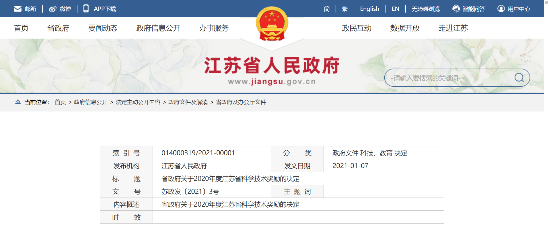 日前,江苏省人民政府发布《省政府关于2020年度江苏省科学技术奖励的决定》,我校共有4项科技成果荣获江苏省科学技术奖,其中一等奖1项,二等奖1项,三等奖2项。