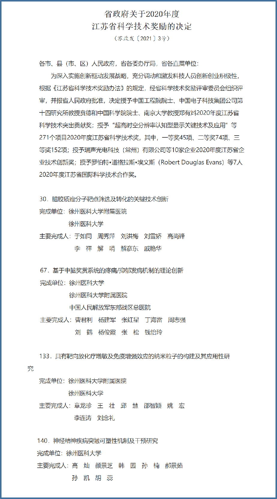 于如同教授团队的“脑胶质瘤分子靶点筛选及转化的关键技术创新”项目获江苏省科学技术奖一等奖;曹君利教授团队的“基于中脑奖赏系统的疼痛/抑郁发病机制的理论创新”项目获江苏省科学技术奖二等奖;高灿教授团队的“神经精神疾病突触可塑性机制及干预研究”项目和章龙珍教授团队的“具有靶向放化疗增敏及免疫增强效应的纳米粒子的构建及其应用性研究”项目获江苏省科学技术奖三等奖。